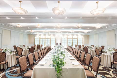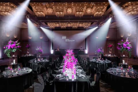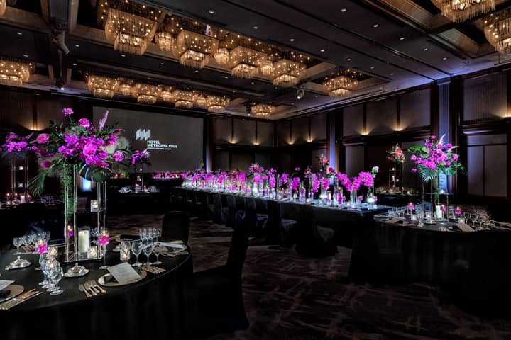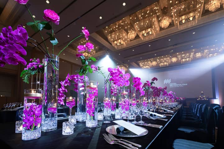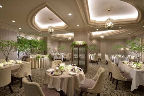 荘厳なシャンデリアが印象的な会場は、晩餐会スタイルの華やかなコーディネートもよく映えます。